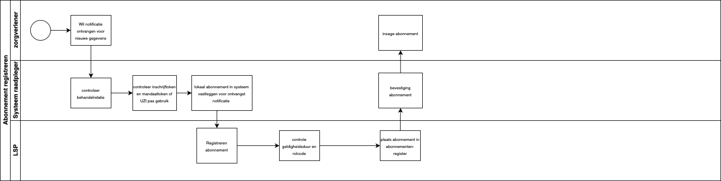 Een zorgverlener wil een notificatie ontvangen als er nieuwe informatie van een patiënt bekend is. Hiervoor kan hij het systeem een abonnement laten afsluiten onder zijn verantwoordelijkheid. De zorgverlener kan dit doen op basis van zijn eigen UZI-pas. Een medewerker kan dit doen onder mandaat van een zorgverlener. Het kan ook geautomatiseerd plaatsvinden door gebruik te maken van VGU.