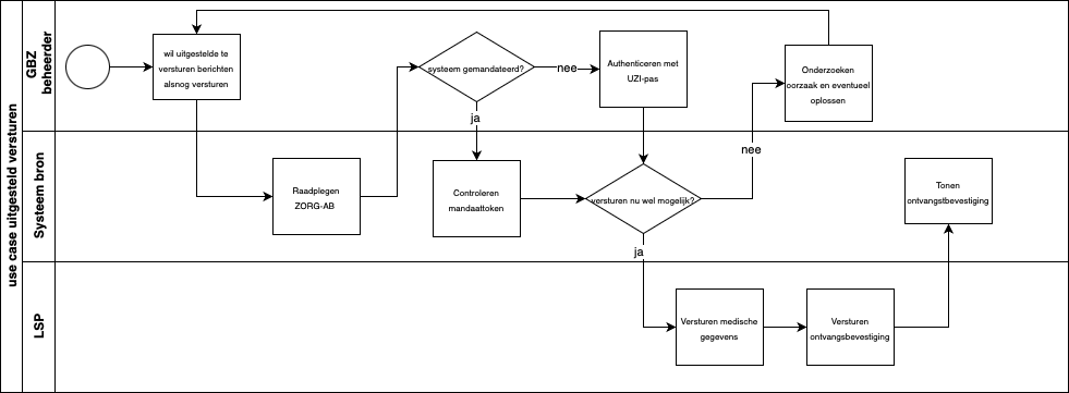 Periodiek, bijvoorbeeld één maal per dag of één maal per twee dagen, controleert de GBZ beheerder of berichten niet verstuurd zijn die wel verstuurd hadden moeten zijn. De GBZ beheerder zal allereerst pogen deze berichten nogmaals te versturen. Hiervoor wordt specifieke functionaliteit in het systeem ter beschikking gesteld. Vanuit het systeem wordt ZORG-AB geraadpleegd. Hieruit volgt informatie of de oorzaak dat het bericht nog niet verstuurd is ligt aan de status van de geadresseerde applicatie ('inactief' / ‘in onderhoud’). Vervolgens wordt het mandaattoken en inschrijftoken gecontroleerd. Indien één van deze tokens niet geldig zijn zal de functioneel beheerder dit kunnen oplossen. Als het bericht alsnog niet verstuurd kan worden zal de GBZ beheerder onderzoek uitvoeren om de oorzaak te achterhalen. In veel gevallen zal het bericht direct verstuurd kunnen worden, bijv. bij een tijdelijke onbeschikbaarheid van één van de (netwerk) componenten in de keten.