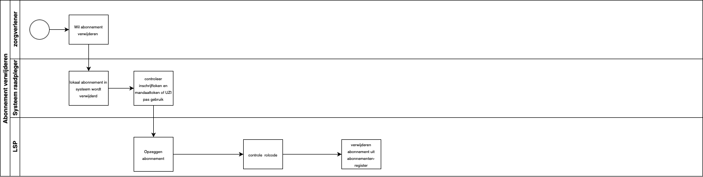 Een verlopen abonnement of een abonnement dat opgezegd wordt door een zorgverlener omdat er bijvoorbeeld geen behandelrelatie meer is, dient door het systeem onder verantwoordelijkheid van de zorgverlener verwijderd te worden. Dit dient zowel lokaal als uit het abonnementenregister verwijderd te worden. Bij verwijdering uit het abonnementenregister wordt gecontroleerd of de zorgverlener geautoriseerd is om een abonnement te verwijderen. De zorgverlener mag een andere rolcode hebben dan de rolcode waarmee het abonnement is afgesloten. Als er maar een autorisatie is voor het verwijderen van abonnementen.