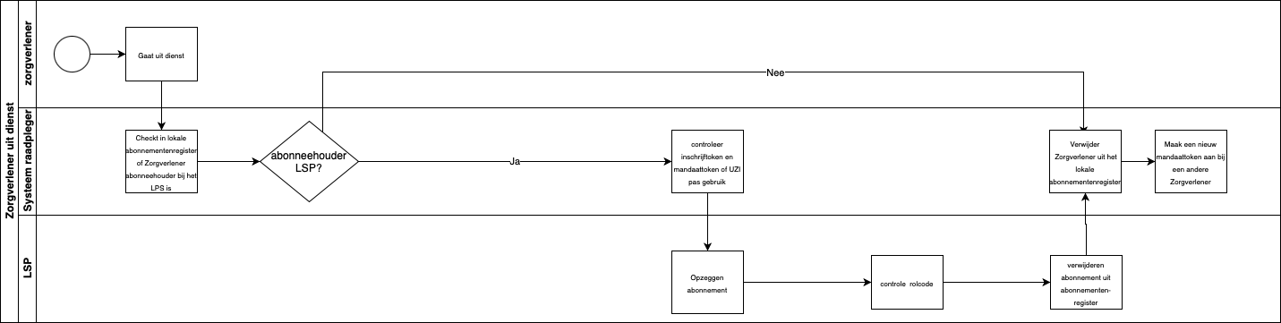 Een zorgverlener gaat uit dienst. De beheerder van het lokale abonnementenregister controleert of het abonnement bij het LSP door deze zorgverlener is afgesloten. Indien dit niet het geval is, dan verwijdert het systeem de zorgverlener uit het lokale register. In het geval dat het abonnement bij het LSP wel d.m.v. de UZI pas en mandaattoken van de medewerker is aangevraagd, moet dit abonnement bij het LSP gestopt worden door het sturen van een opzeggen abonnement bericht. Het abonnementen register verwijdert dan dit abonnement. In het lokale abonnementenregister moet het abonnement en de zorgverlener ook verwijderd worden. Er moet een nieuw abonnement worden afgesloten onder mandaat van een andere zorgverlener die brede autorisatierechten heeft (zie verder een aanmaken mandaattoken en abonnement registreren).
