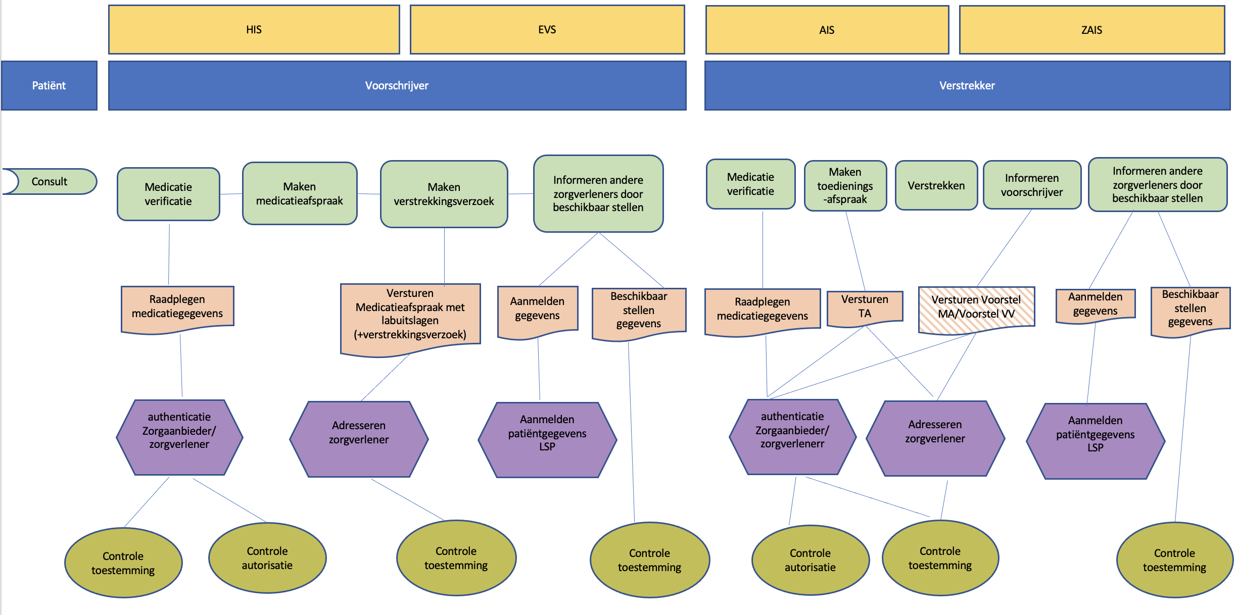 In de paarse en rode lagen staat aangegeven welke infrastructurele diensten gebruikt dienen te worden. Voor de adressering van het verstrekkingsverzoek dient gebruik gemaakt te worden van het Zorg-AB. De toedieningsafspraak wordt gestuurd naar de voorschrijver. Als de verstrekker niet zeker weet wie de voorschrijver is, dient hij de bijbehorende MA op te vragen, zodat hij de TA naar de juiste voorschrijver kan adresseren. Bij de opvraag van de medicatiegegevens wordt aan de hand van de UZI-rolcode gecontroleerd of de zorgverlener medicatiegegevens uit het patiëntendossier mag raadplegen. Tevens wordt gecontroleerd of de patiënt toestemming heeft gegeven voor het beschikbaarstellen van de gegevens. Het hoe staat beschreven in Toestemming