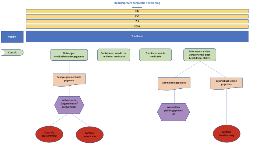 In de paarse en rode lagen staat aangegeven welke infrastructurele diensten gebruikt dienen te worden. Bij de opvraag van de medicatiegegevens wordt aan de hand van de UZI-rolcode gecontroleerd of de zorgverlener medicatiegegevens uit het patiëntendossier mag raadplegen. Tevens wordt gecontroleerd of de patiënt toestemming heeft gegeven voor het beschikbaar stellen van de gegevens. Het hoe staat beschreven in Toestemming.