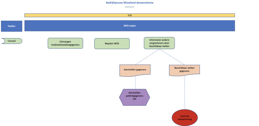 Wanneer een patiënt antistollingsmedicatie moet gaan gebruiken, maakt de voorschrijvend arts een medicatieafspraak met de patiënt over de te gebruiken antistollingsmedicatie, conform het beschreven proces van voorschrijven. De trombosedienst bepaalt het specifieke doseerschema op basis van de therapeutische INR range en de gemeten INR. De trombosedienst maakt daarmee een nadere invulling van de medicatieafspraak en stuurt het wisselend doseerschema (WDS) naar de patiënt en of eventuele toediener. Daarnaast wordt het WDS beschikbaar gesteld voor andere zorgverleners. Communicatie tussen trombosedienst en apothekers en tussen voorschrijvers en trombosedienst vindt nog niet plaats via het LSP.